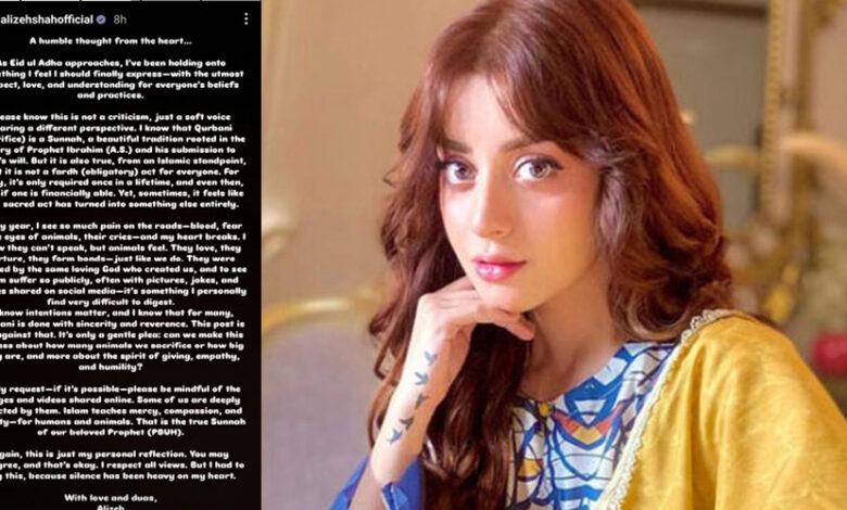 ISLAMABAD: Renowned Pakistani actress Alizeh Shah has shared a heartfelt message ahead of Eid ul-Adha, sparking widespread discussion across social media platforms. In her Instagram post, the actress expressed her concerns over the public display of animal sacrifice and its impact on sensitive individuals.