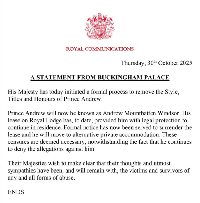 According to a **Buckingham Palace statement**, Andrew will now be known simply as **Andrew Mountbatten-Windsor** and will no longer be referred to as “Prince.” The statement added that he will soon move from **Royal Lodge** to a private residence.