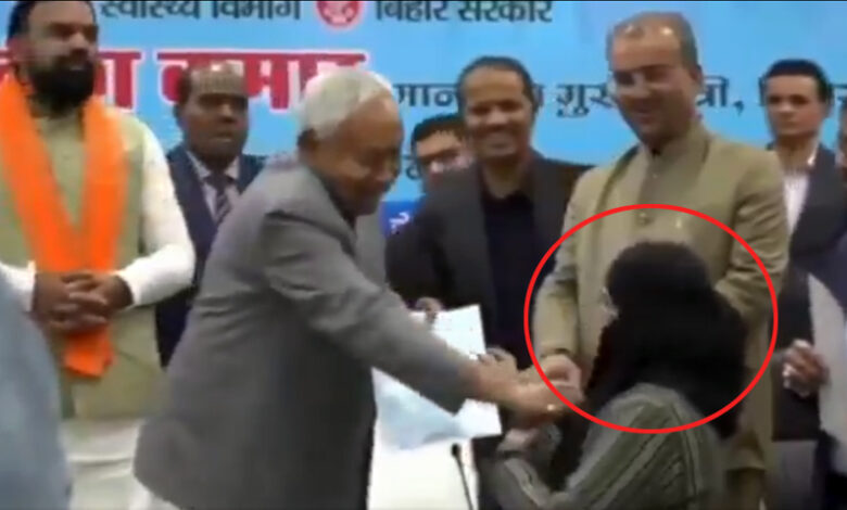 CM Nitish Kumar forcibly removes a Muslim woman doctor’s veil during an appointment letter ceremony.