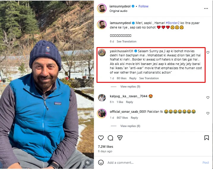 Responding in the comments, Yasir Hussain addressed Sunny Deol, saying, “Hello Sunny Bhai, I have enjoyed your films since childhood, but the voice of love reaches hearts, hatred does not. The voice of *Border 2* only reached the hearts of those spreading hatred.”