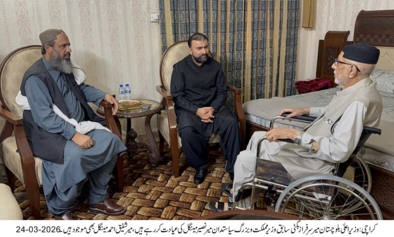 Karachi (Daily Qudrat Quetta): Balochistan Chief Minister Mir Sarfaraz Bugti visited former Balochistan Chief Minister Mir Naseer Khan Mengal at the Mengal House in Karachi, inquiring about his health and extending his best wishes. The visit was accompanied by Senator Agha Shahzeb Durrani and Provincial Health Minister Bakht Muhammad Kakar.